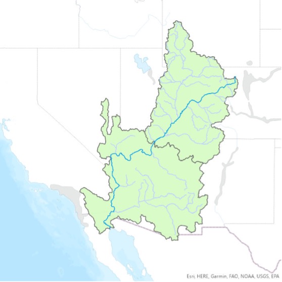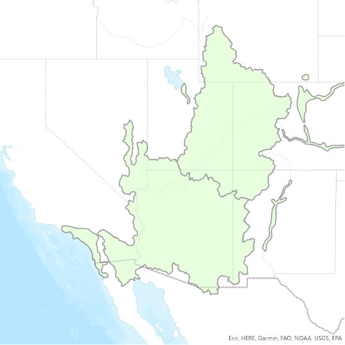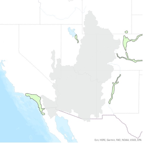 The Adjacent Areas Served, as defined in this report, generally correspond with the “adjacent areas that receive Colorado River water” as defined by the U.S. Bureau of Reclamation (2012), with two notable differences. One is the watershed of the Salton Sea, a portion of which is classified as an adjacent area by the Bureau of Reclamation because it receives Colorado River water via the All-American Canal and Colorado River Aqueduct but no longer contributes tributary flow to the river. However, before Hoover Dam was built, the Colorado River would sometimes migrate from its current channel and into the Salton Sink (see, e.g., Ross 2020). Because of that connection, we include it within the hydrologic CRB area, rather than in Adjacent Areas Served. See U.S. Bureau of Reclamation, 2012, p. ES-3.