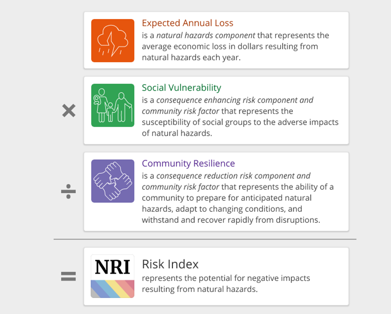 Measures the relative risk to a community based on 18 natural hazards. Source: Determining Risk | National Risk Index (fema.gov). See also: National Risk Index.